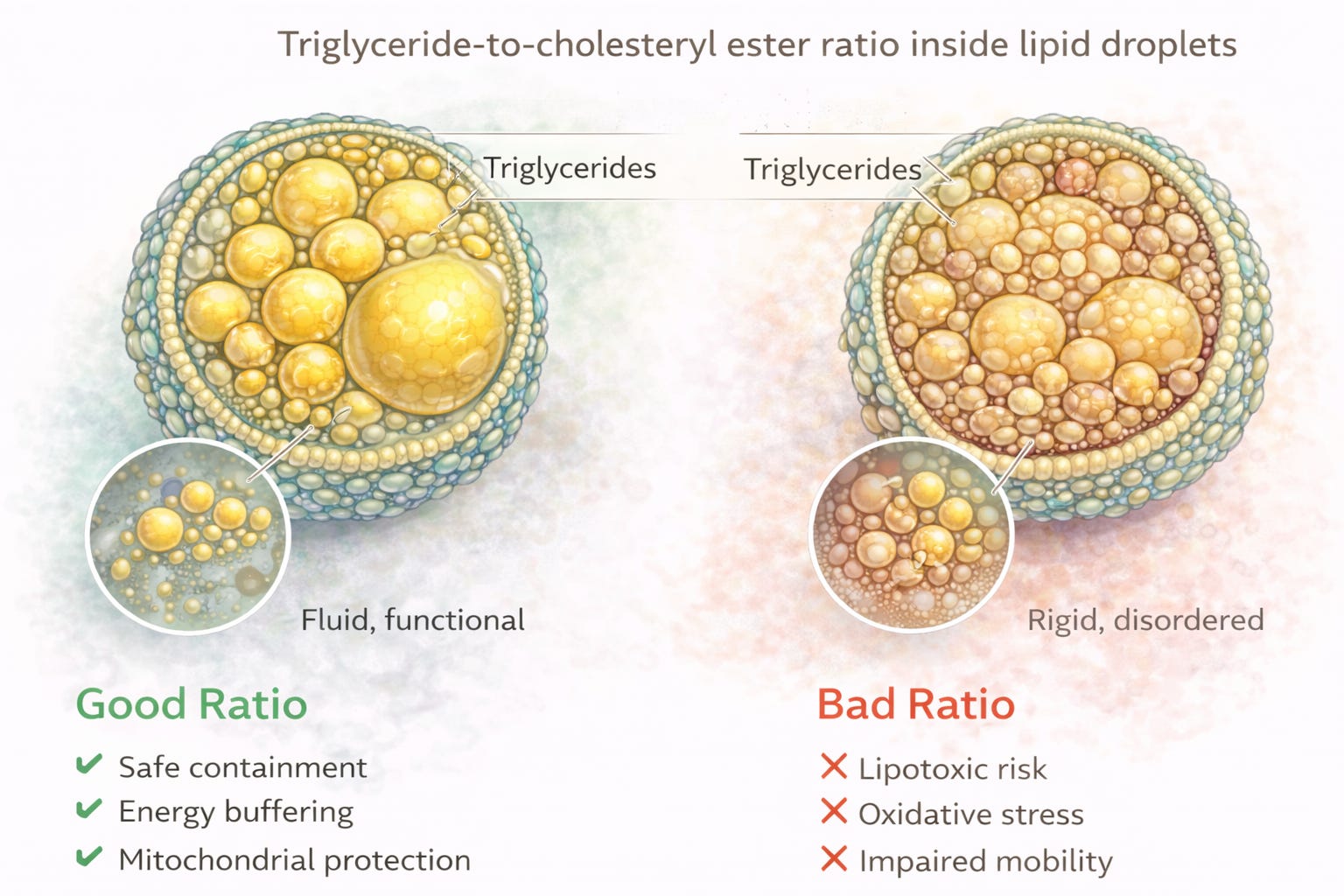 Triglycerides, in sufficient proportion, help keep lipid droplets fluid and functional. This is not about excess. It’s about balance.